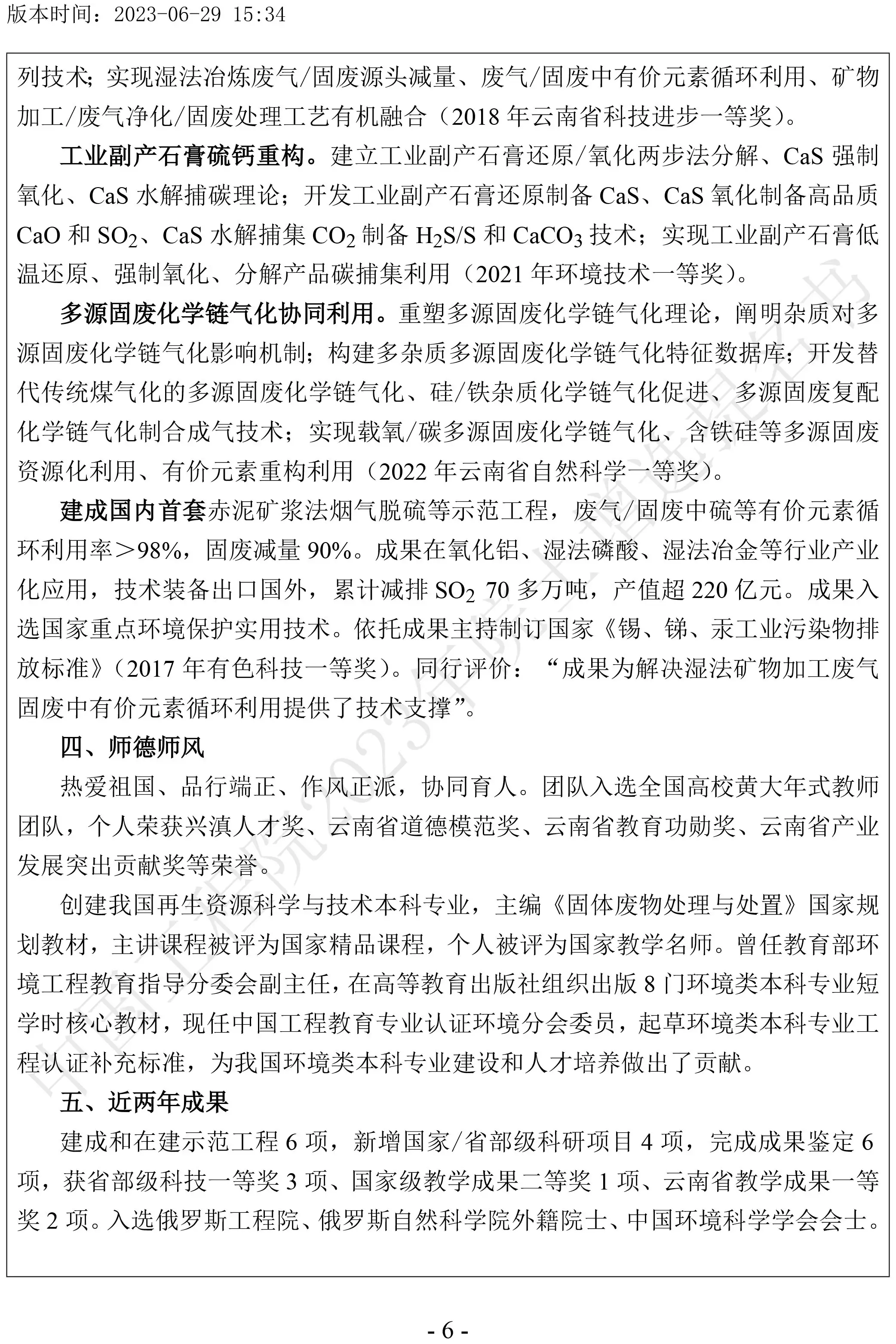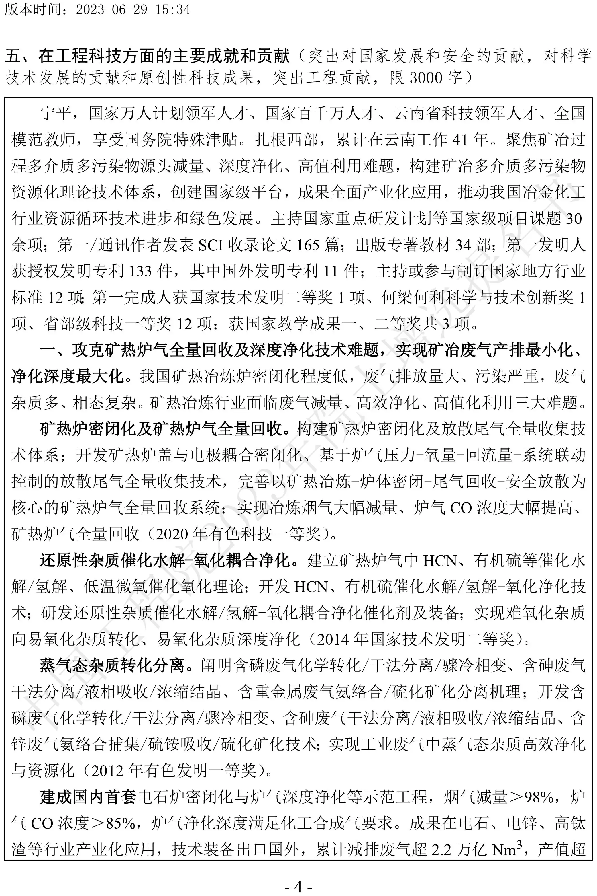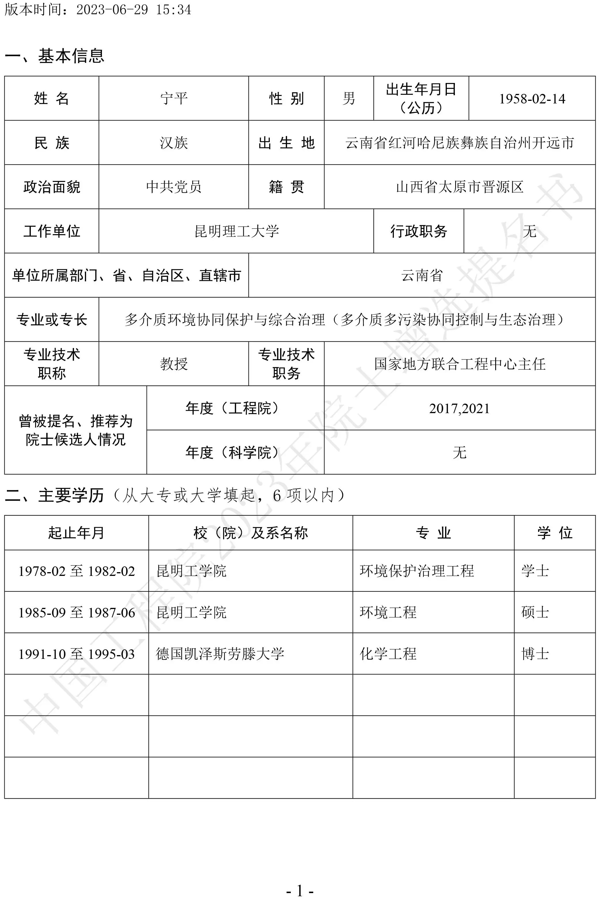 宁平同志建成和在建示范工程6项,新增国家/省部级科研项目4项,完成成果鉴定6项,获省部级科技一等奖3项、国家级教学成果二等奖1项、云南省教学成果一等奖2项。入选俄罗斯工程院、俄罗斯自然科学院外籍院士、中国环境科学学会会士。